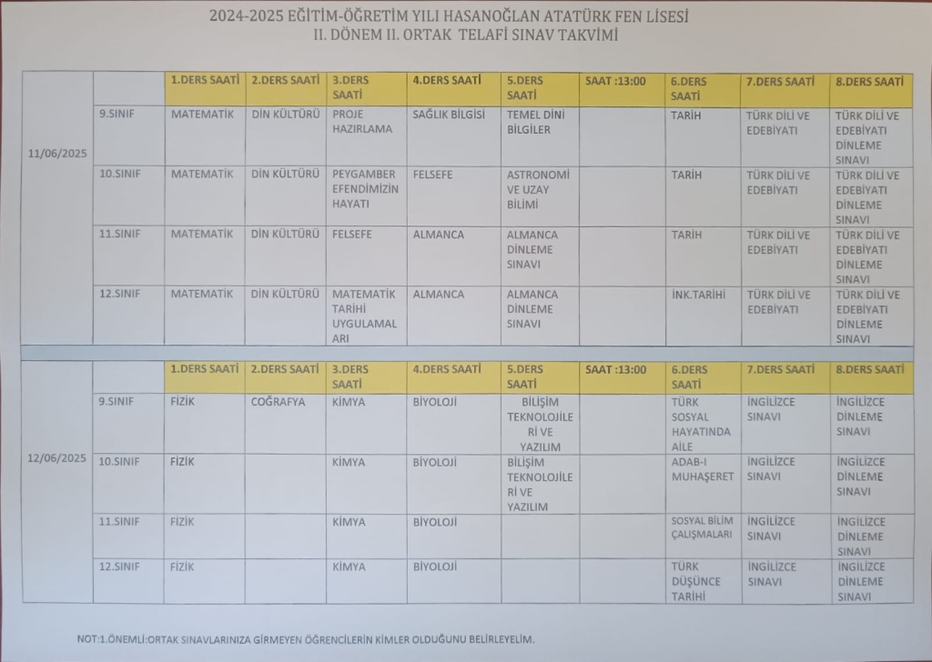 Mazeretleri nedeniyle 2. Dönem 2. Yazılıya katılamayan öğrencilerimizin dikkatine. Telafi sınavları 11-12 Haziran 2025 tarihlerinde yapılacaktır.